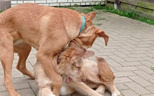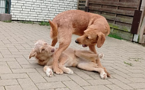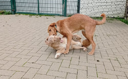 Mit den anderen Hunden in der Hundegruppe kommt sie prima zurecht, da lernt sie gerade wie weit man im Sozialkontakt so gehen kann. Ähnlich gestaltet sich das bei uns Menschen, als junger Hund testet man eben wie das Zusammenleben mit dem Menschen so funktioniert. Grundlegend ist sie aber ein sanftes Mädchen die einfach nur gefallen möchte.